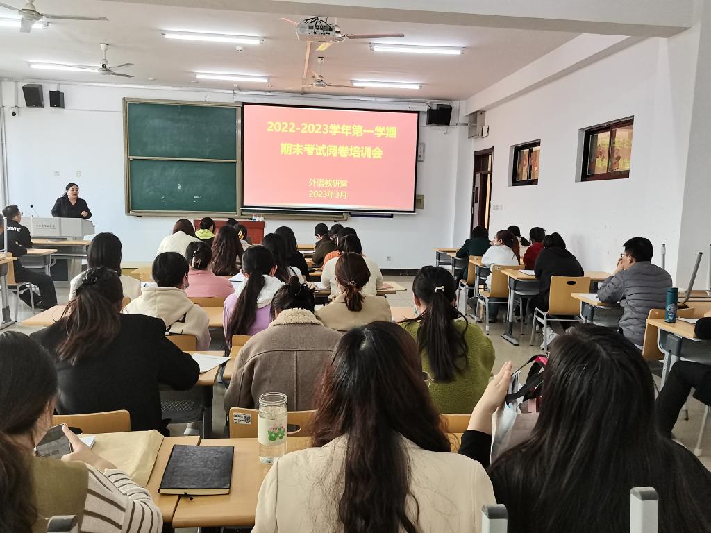 为了做好2022-2023学年第一学期期末考试阅卷工作,外语教研室于3月6日下午在10#417召开了2022-2023学年第一学期期末阅卷专题培训会。此次会议工作由外语教研室主任刘伟伟主持,外语教研室全体教师参加了本次活动。