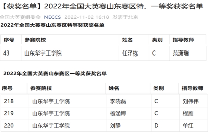 近日,全国大学生英语竞赛(山东赛区)决赛成绩公布,欧冠官网学子在本次比赛中再创佳绩,获国家级特等奖1项、一等奖3项。