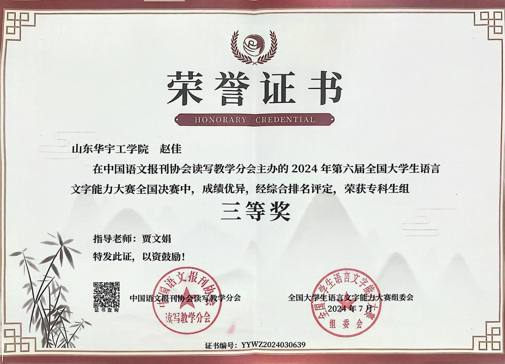 近日,第六届“全国大学生语言文字能力大赛”全国决赛落下帷幕,我校赵佳同学取得了国赛三等奖的好成绩,实现了欧冠官网在该类比赛中的新突破。