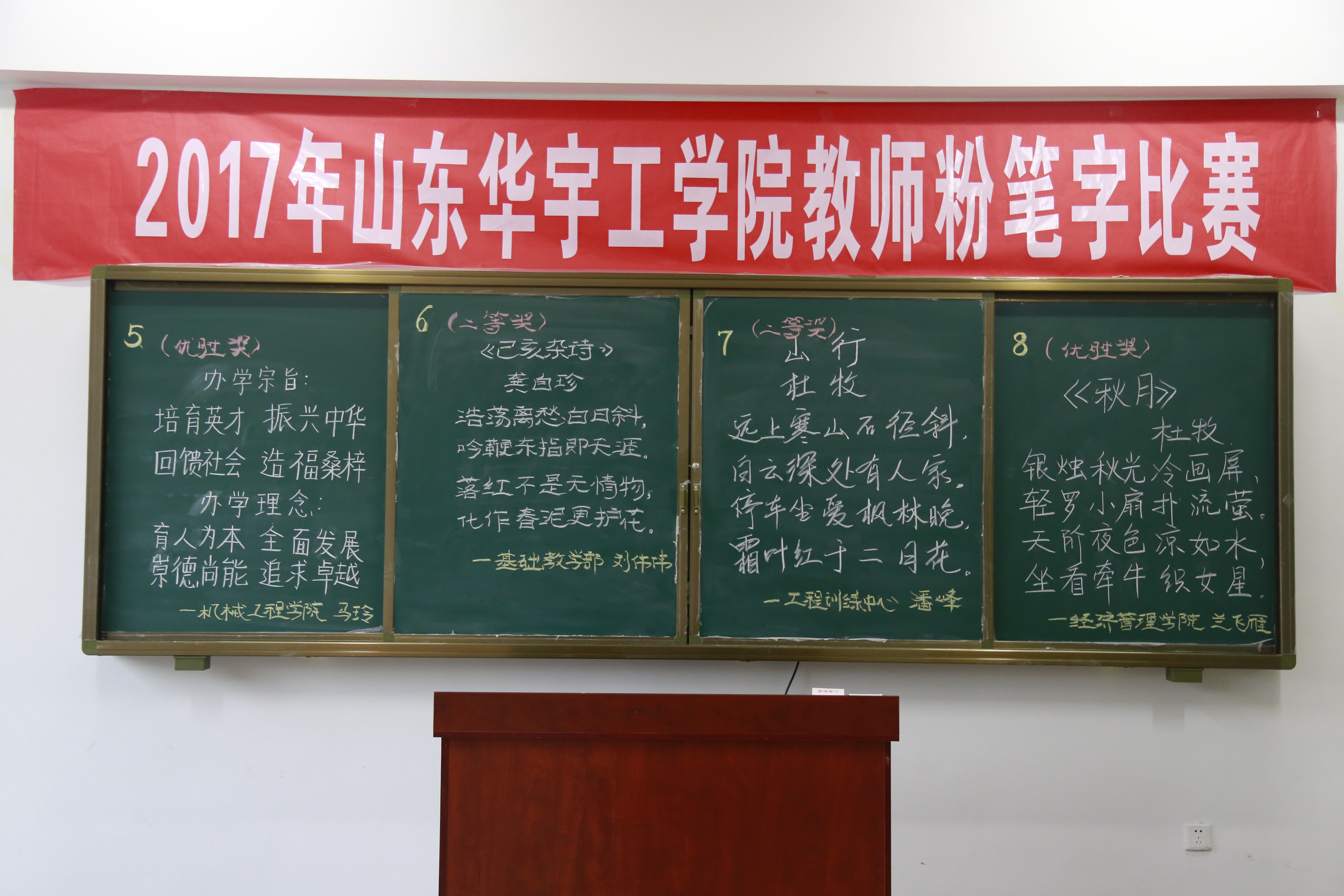 为积极引导欧冠官网教师重视教学基本功训练,强化板书设计意识,养成写规范字的习惯,9月25日下午,欧冠官网在21号教学楼举办2017年山东华宇工学院教师粉笔字比赛。本次比赛由教务处主办,基础教学部协办,教务处处长贺红岩、各部门领导及部分任课教师观摩了比赛。