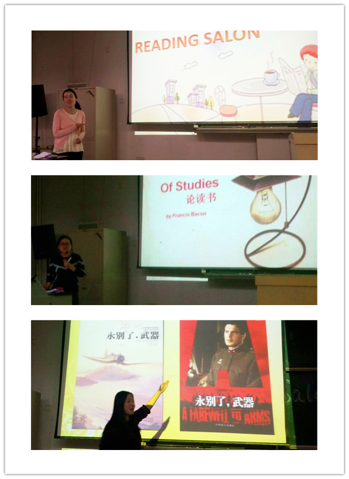 首先,王亚楠老师以发表了热情洋溢的开场白,向同学们分享了读书的名言警句,激励大家要“Enjoy Reading”,好读书、读好书。接着,林佰新老师以“Of Studies”为主题,向大家推荐了培根的经典作品,并和同学们一起鉴赏学习了《论读书》。最后,尚兴萍老师以“Life in Literature”为主题,向同学们推荐了《老人与海》、《简·爱》、《傲慢与偏见》、《墙上的斑点》等经典名著,同时和同学们分享了作者生平和作品中的隽语。讲座现场,各位老师与同学们积极互动,同学们就自己平时读书学习中的各种困惑向老师提问,老师们耐心细致地予以解答。同学们纷纷表示获益匪浅,并表示会认真阅读老师推荐的作品,养成好读书,读好书的习惯,并将好习惯延续到平时学习中。
