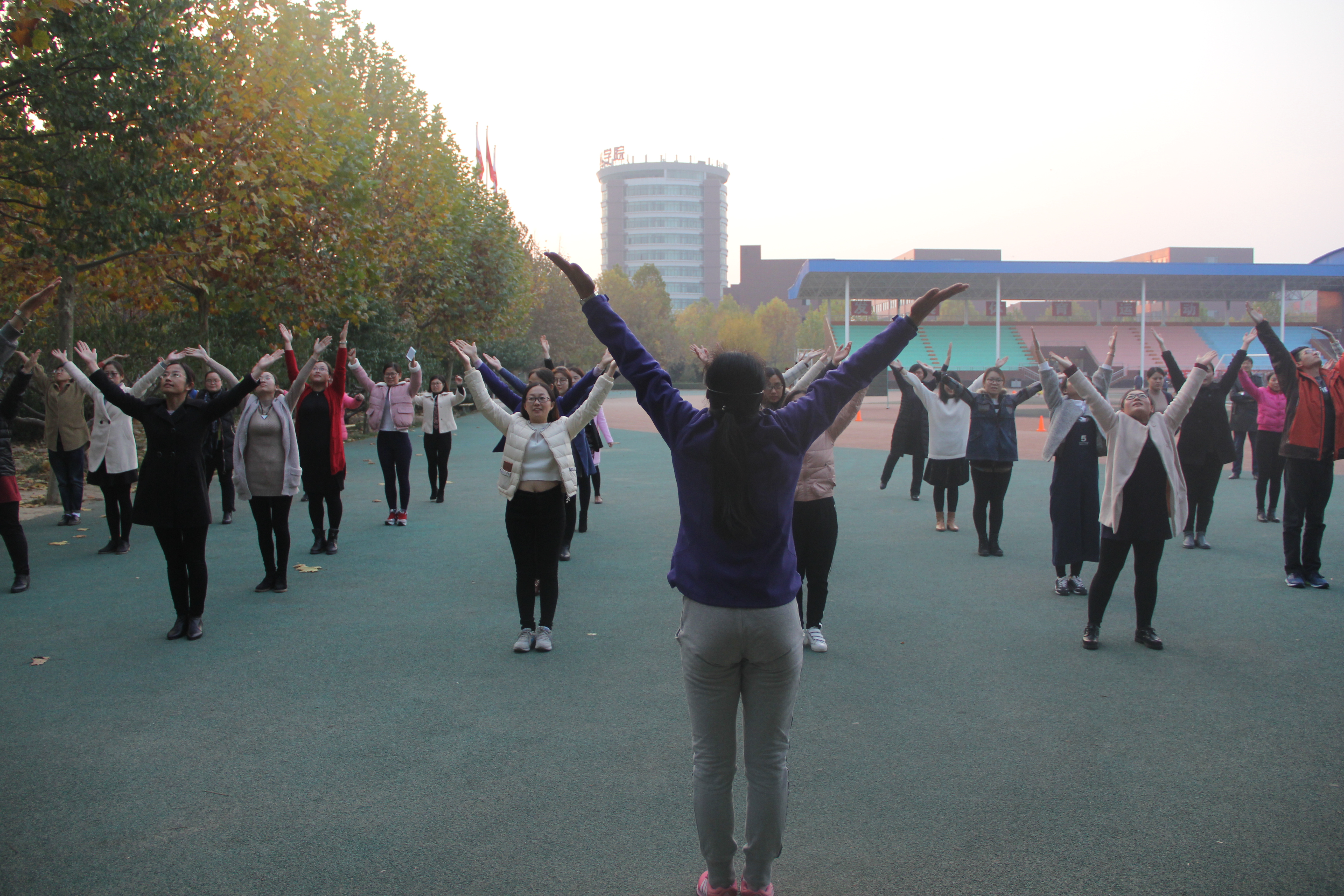11月6日下午4:30分,操场上,微风习习,基础教学部全体教师在基础教学部副主任李琦的带领下,进行了第九套广播体操的训练。