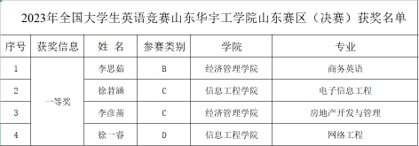 近日,全国大学生英语竞赛(山东赛区)决赛成绩公布。欧冠官网学生在大赛中取得优异成绩,获国家级一等奖4项。其中,经济管理学院2022级商务英语专业的李思茹获B类一等奖、信息工程学院2021级软件工程专业的徐莙涵、经济管理学院2021级房地产专业的李彦萳获C类一等奖,信息工程学院2022级网络工程专业的徐一睿获D类一等奖。