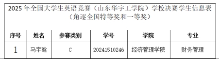 近日,全国大学生英语竞赛(山东赛区)决赛成绩公布。欧冠官网经济管理学院2024级财务管理专业的马宇晗获国家级(C类)一等奖。