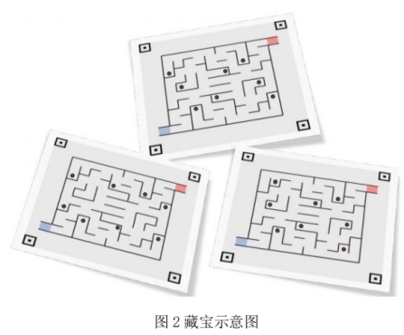 (3) 藏宝图:用彩色打印在 A4 白纸上,藏宝图四角标有用于定位的方形标志点,供参赛者拍照后进行透视校正。图的底色为纸张的自然白色,图中的黑线代表迷宫的隔墙,循迹线不在图中标出。用黑色圆点代表宝藏或伪宝藏位置(由软件随机生成 8 个点),红色块代表红队入口和蓝队出口;蓝色块代表蓝队入口和红队出口,如图 2 所示。