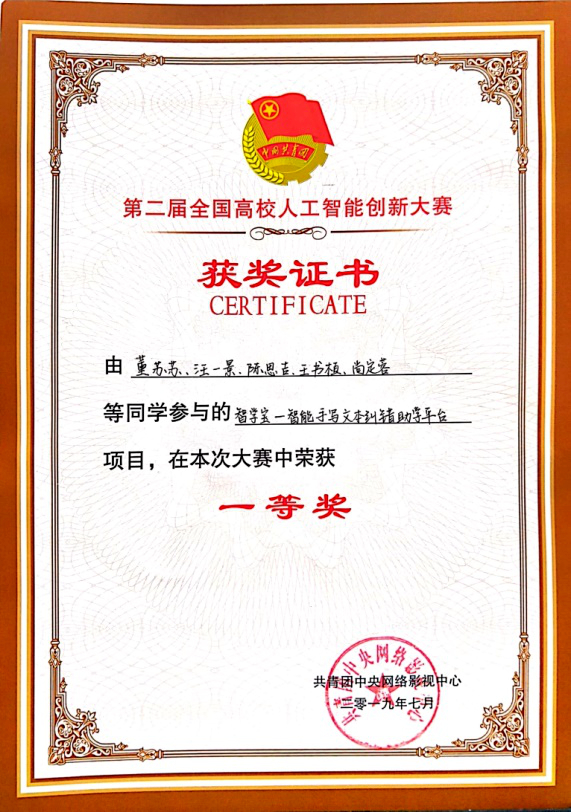 本网讯 (通讯员 邢高峰)近日,2019年全国高校人工智能创新大赛在西南交通大学犀浦校区举行,由kaiyun官网翟社平老师指导,研究生董苏苏、汪一景、陈思吉、王书桓、尚定蓉完成的《智学宝——智能手写文本纠错助学平台》荣获一等奖。