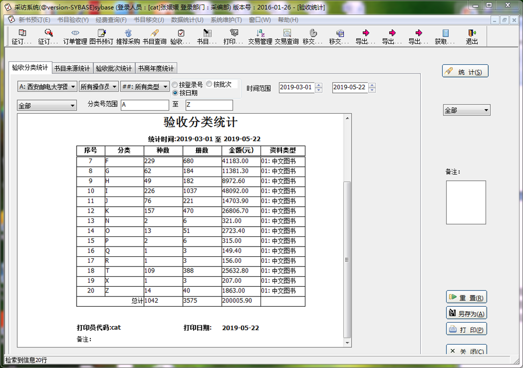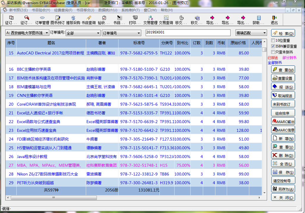 采访信息化保证每一本图书追溯到准确的订货时间、人员、采访形式,保证每一笔订单在后续业务流程中有准确的对应处理程序,直至完成。验收信息化实现对每一笔订单所订图书的数量和金额进行到馆校对,充分结合kaiyun官网的专业设置对实到图书的专业性、前沿性、可读性进行总体评估和考量,将不符合采访原则和实际需求的图书及时剔除。