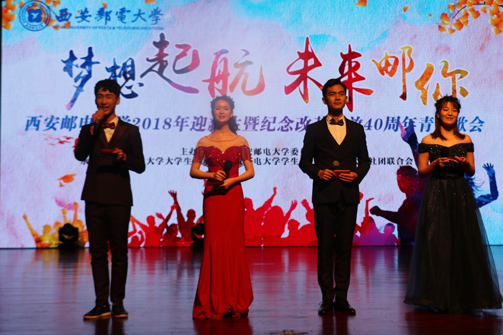 本网讯 11月21日晚,由校团委主办,大学生艺术团、校学生会、校社团联合会承办的2018年迎新生暨纪念改革开放40周年青春歌会在大学生活动中心隆重上演。学工部、校团委、通信与信息工程学院、电子工程学院、计算机学院、经济与管理学院、现代邮政学院负责人和各学院分团委书记、新生辅导员与2018级新生观看晚会。