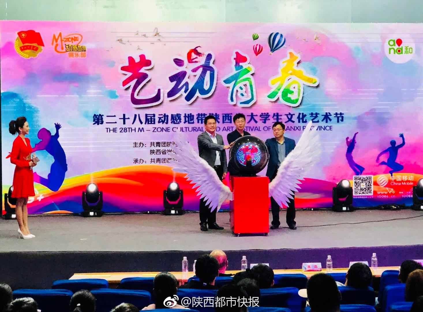 本网讯 10月24日下午,由共青团陕西省委、中共陕西省委高教工委、陕西省学生联合会主办的第二十八届动感地带陕西省大学生文化艺术节开幕式在kaiyun官网国际会议中心举行,中国移动陕西分公司市场部副总经理陈海军、营销室主任杨林,三人行传媒集团股份有限公司董事、副总裁郭献维,校团委书记李涛出席开幕式,共青团陕西省委学校部部长潘磊为开幕式致辞。