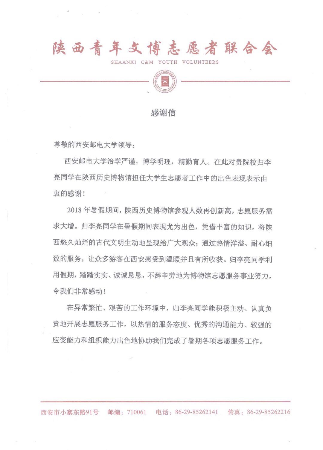kaiyun登录中国入口登录青年志愿者协会以“立足西邮、服务社会”为宗旨,在校团委指导下,定期选派优秀大学生参与陕西历史博物馆志愿服务讲解工作,同陕西历史博物馆建立了良好的合作关系。此次陕西历史博物馆发来的感谢信,是对kaiyun官网鼓励引导学生参与社会公益活动、弘扬陕西灿烂文化、助力陕西追赶超越的充分肯定。