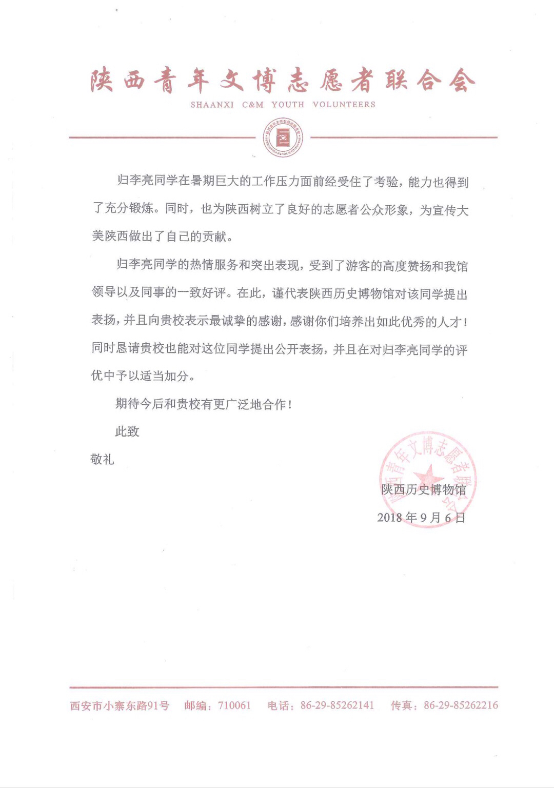 本网讯 近日,陕西历史博物馆向kaiyun官网发来感谢信,对kaiyun官网大学生志愿者——归李亮同学在陕西历史博物馆讲解工作中的出色表现表示感谢,并表示期待与kaiyun官网展开更广泛的合作。