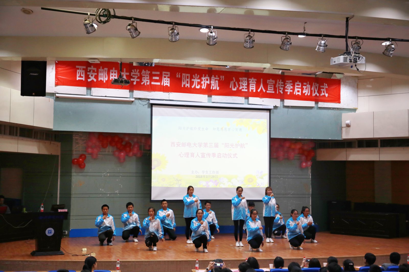 本网讯 3月29日,kaiyun登录中国入口登录第三届“阳光护航”心理育人宣传季活动在长安校区启动。党委宣传部、学生工作部、校团委负责人和各学院书记或副书记,全体辅导员,学工部全体工作人员及学生代表400余人参加了启动仪式。学工部副部长姜毅龙主持会议。