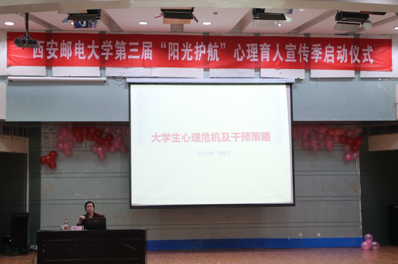 启动仪式后,西北大学公共管理学院郑安云教授为全体辅导员和班级心理委员等学生骨干进行《大学生常见心理危机及干预策略》专题培训。本届心理育人宣传季活动以“阳光护航珍爱生命知恩感恩育心育德”为主题,期间将组织校院两级的心理健康教育宣传系列活动,不断扩大心理健康教育工作覆盖面和活动影响力,努力培育自尊自信、理性平和、阳光向上的积极心态。