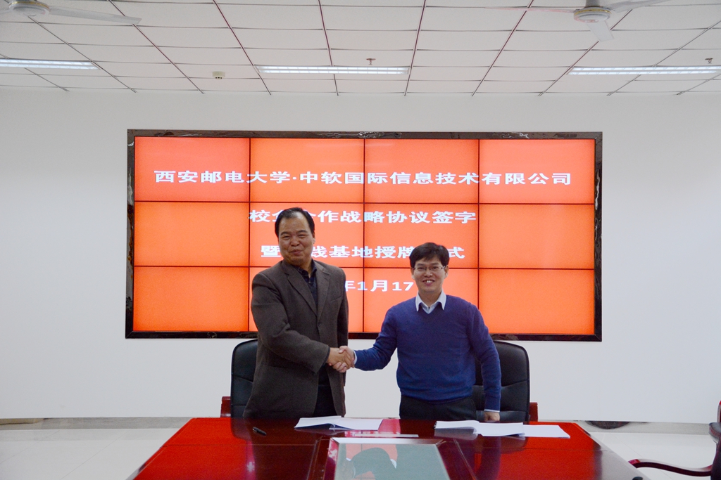 本网讯 1月17日下午,中软国际信息技术有限公司副总裁徐建民一行来校交流,副校长巩稼民与徐建民签订了校企合作战略协议,双方举行校企合作实践基地授牌仪式。计算机学院副院长翟社平主持签约及授牌仪式。