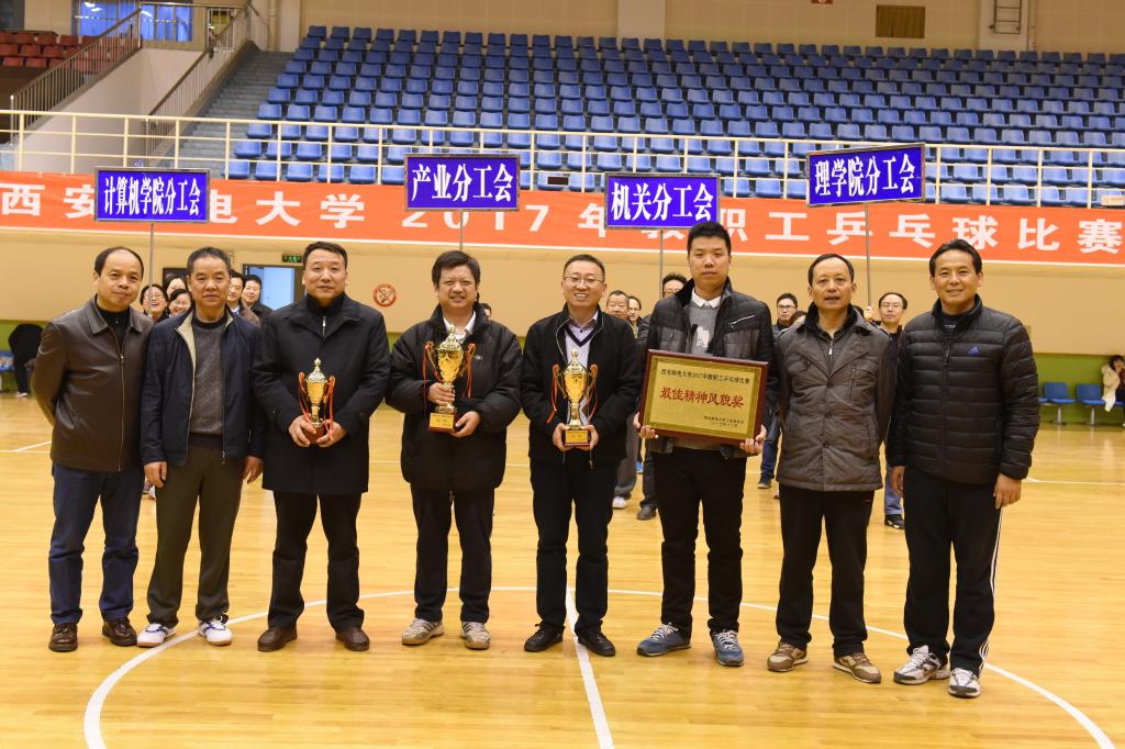 本网讯 12月6日晚,kaiyun官网2017年教职工乒乓球比赛决赛在长安校区体育馆举行。经过激烈的角逐,产业分工会夺得冠军,机关分工会获得亚军,计算机学院分工会获得季军,理学院分工会获最佳精神风貌奖。