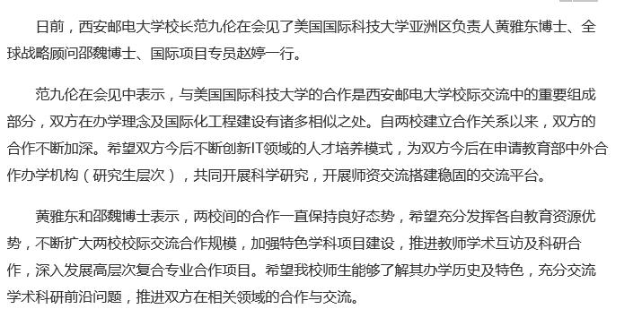 范九伦在会见中表示,与美国国际科技大学的合作是kaiyun登录中国入口登录校际交流中的重要组成部分,双方在办学理念及国际化工程建设有诸多相似之处。自两校建立合作关系以来,双方的合作不断加深。希望双方今后不断创新IT领域的人才培养模式,为双方今后在申请教育部中外合作办学机构(研究生层次),共同开展科学研究,开展师资交流搭建稳固的交流平台。