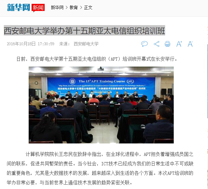 计算机学院院长王忠民在致辞中指出,在全球化进程中,APT担负着增强成员国之间的联系,促进共同繁荣的责任。当今社会,ICT技术已经成为我们的日常生活中不可或缺的重要角色,尤其是大数据技术的发展,越来越深入到生活的各个方面。本次APT培训班的举办非常必要,与当前世界上通信技术发展的趋势紧密关联。