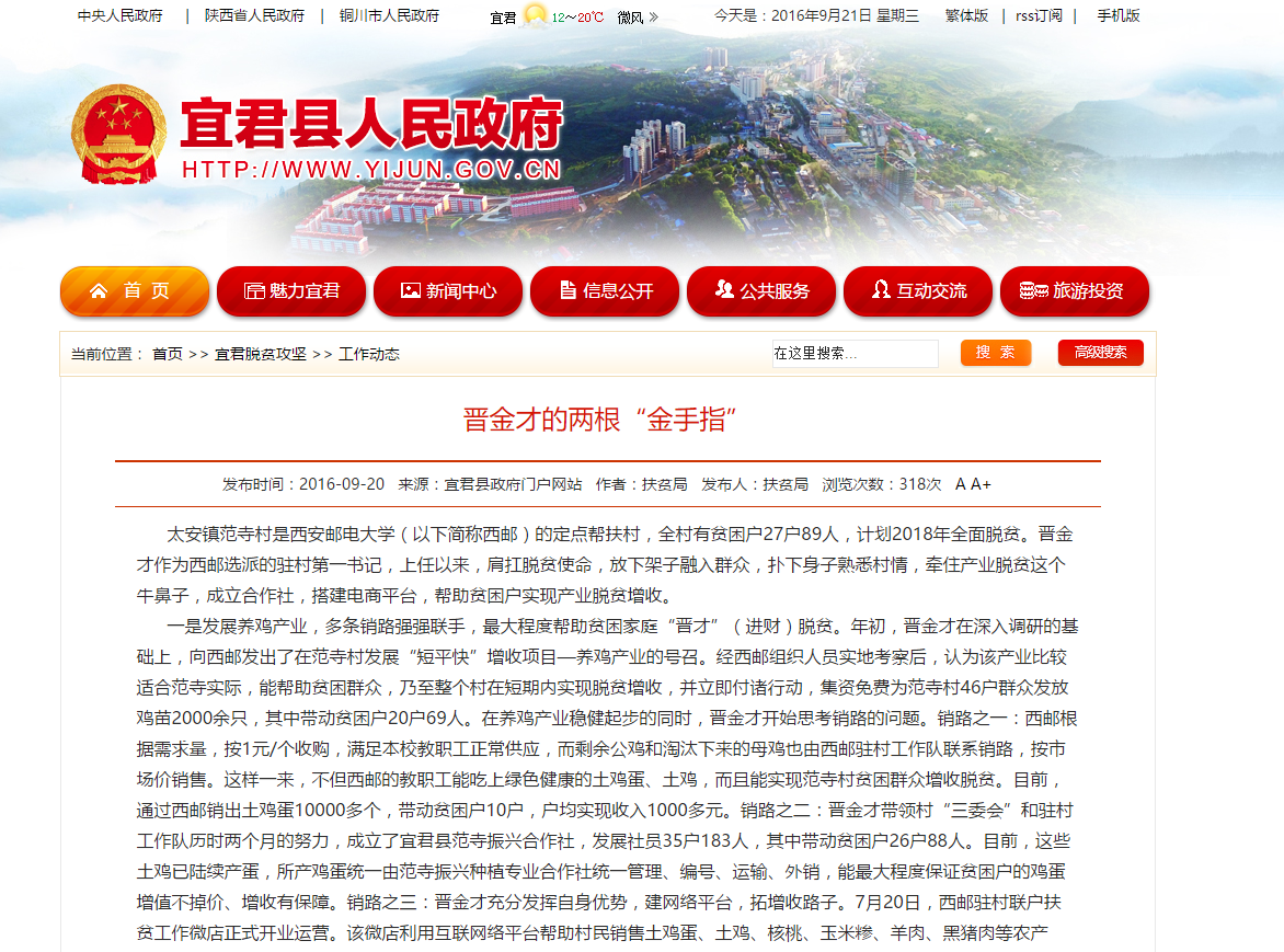 一是发展养鸡产业,多条销路强强联手,最大程度帮助贫困家庭“晋才”(进财)脱贫。年初,晋金才在深入调研的基础上,向西邮发出了在范寺村发展“短平快”增收项目—养鸡产业的号召。经西邮组织人员实地考察后,认为该产业比较适合范寺实际,能帮助贫困群众,乃至整个村在短期内实现脱贫增收,并立即付诸行动,集资免费为范寺村46户群众发放鸡苗2000余只,其中带动贫困户20户69人。在养鸡产业稳健起步的同时,晋金才开始思考销路的问题。销路之一:西邮根据需求量,按1元/个收购,满足本校教职工正常供应,而剩余公鸡和淘汰下来的母鸡也由西邮驻村工作队联系销路,按市场价销售。这样一来,不但西邮的教职工能吃上绿色健康的土鸡蛋、土鸡,而且能实现范寺村贫困群众增收脱贫。目前,通过西邮销出土鸡蛋10000多个,带动贫困户10户,户均实现收入1000多元。销路之二:晋金才带领村“三委会”和驻村工作队历时两个月的努力,成立了宜君县范寺振兴合作社,发展社员35户183人,其中带动贫困户26户88人。目前,这些土鸡已陆续产蛋,所产鸡蛋统一由范寺振兴种植专业合作社统一管理、编号、运输、外销,能最大程度保证贫困户的鸡蛋增值不掉价、增收有保障。销路之三:晋金才充分发挥自身优势,建网络平台,拓增收路子。7月20日,西邮驻村联户扶贫工作微店正式开业运营。该微店利用互联网络平台帮助村民销售土鸡蛋、土鸡、核桃、玉米糁、羊肉、黑猪肉等农产品。截至目前已帮助群众销售农副产品价值20000余元,带动贫困户23户,户均收入1000多元。据了解,当前范寺村以“土鸡蛋”为主的农副产品供不应求,下一步,晋金才还将继续帮助群众扩大养鸡规模,让“小鸡蛋”撬动“大产业”,带动贫困户在家门口做生意、挣大钱、增收益、快脱贫、奔小康。二是发展油用牡丹产业,长远着眼,帮助贫困家庭开辟新的“晋才”(进财)门路。今年,在晋金才的积极努力下,西邮立足村情,着眼市场,出资购买牡丹苗100000株,在范寺村建成50亩油用牡丹示范园1个,发展油用牡丹产业。该产业采取“帮扶单位+企业+合作社+农户”的形式,帮扶单位负责致富信息提供和前期苗木购买,企业负责产品收购和技术培训服务,合作社负责组织农户种植和管理,形成以牡丹籽油、牡丹花蕊茶、牡丹全花茶、牡丹蜂蜜、牡丹鸡蛋等产业链。预计到2018年可实现户均2亩油用牡丹,亩产牡丹籽100斤,按市场价10元/斤计算,亩收入可达到1000元,贫困家庭户均收入可达2500元。同时,油用牡丹属木本油料作物,根据自身自繁自育的特点,亩产量还会逐年增加。