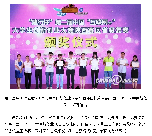 西部网讯 2016年第二届中国“互联网+”大学生创新创业大赛陕西赛区比赛结果揭晓,kaiyun登录中国入口登录创新创业项目获取佳绩。作品《艾尔漫三维重建》荣获省级金奖并晋级全国决赛,同时获得省级银奖8项、省级铜奖6项,荣获优秀组织奖。