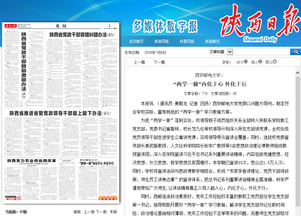 为发挥好党支部书记和党员领导干部的带学促学作用,西邮组建了教育讲师团,举办党员骨干专题培训,开展学生党员骨干示范宣讲,百名先进公寓志愿者服务团,与师生党员面对面交流,促进学生自我教育、自我提高;充分利用多媒体平台,发挥校园网、校报、“两学一做”学习教育专题网站、“两学一做”学习教育微信群、“西邮党员工作站”微信公众平台等作用,营造学习教育良好氛围。促进个人自学,做到线上线下学习相结合,实现日常、经常全覆盖。