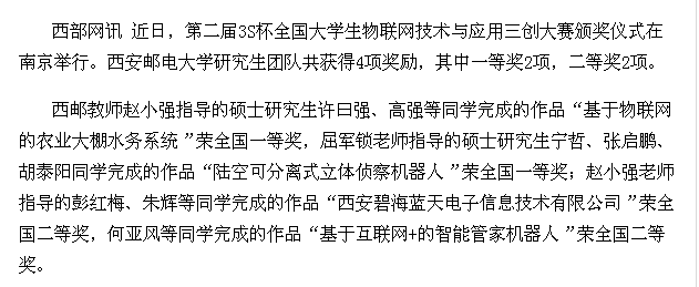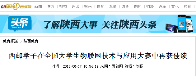 西邮教师赵小强指导的硕士研究生许曰强、高强等同学完成的作品“基于物联网的农业大棚水务系统”荣全国一等奖,屈军锁老师指导的硕士研究生宁哲、张启鹏、胡泰阳同学完成的作品“陆空可分离式立体侦察机器人”荣全国一等奖;赵小强老师指导的彭红梅、朱辉等同学完成的作品“西安碧海蓝天电子信息技术有限公司”荣全国二等奖,何亚风等同学完成的作品“基于互联网+的智能管家机器人”荣全国二等奖。