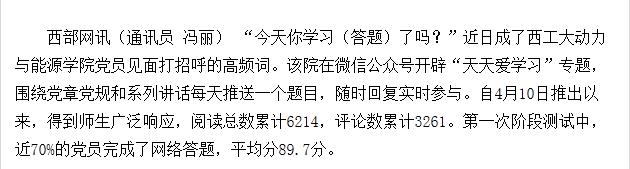 西部网讯(通讯员 冯丽) “今天你学习(答题)了吗?”近日成了西工大动力与能源学院党员见面打招呼的高频词。该院在微信公众号开辟“天天爱学习”专题,围绕党章党规和系列讲话每天推送一个题目,随时回复实时参与。自4月10日推出以来,得到师生广泛响应,阅读总数累计6214,评论数累计3261。第一次阶段测试中,近70%的党员完成了网络答题,平均分89.7分。