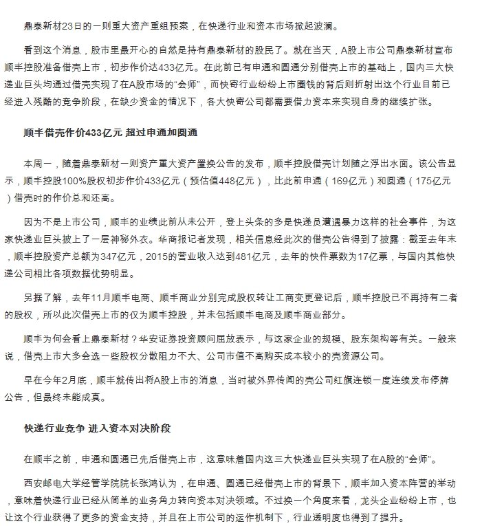 看到这个消息,股市里最开心的自然是持有鼎泰新材的股民了。就在当天,A股上市公司鼎泰新材宣布顺丰控股准备借壳上市,初步作价达433亿元。在此前已有申通和圆通分别借壳上市的基础上,国内三大快递业巨头均通过借壳实现了在A股市场的“会师”,而快寄行业纷纷上市圈钱的背后则折射出这个行业目前已经进入残酷的竞争阶段,在缺少资金的情况下,各大快寄公司都需要借力资本来实现自身的继续扩张。