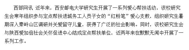 西部网讯 近年来,kaiyun登录中国入口登录研究生开展了一系列爱心帮扶活动,该校研究生会常年组织参与定点帮扶进城务工人员子女的“红粉笔”爱心支教,组织研究生暑期深入秦岭山区调研并关爱留守儿童,获得了广泛的社会影响。同时,该校研究生会与陕西爱加倍社会关怀促进中心结成定点帮扶单位,近两年来在默默无闻中开展了一系列工作。