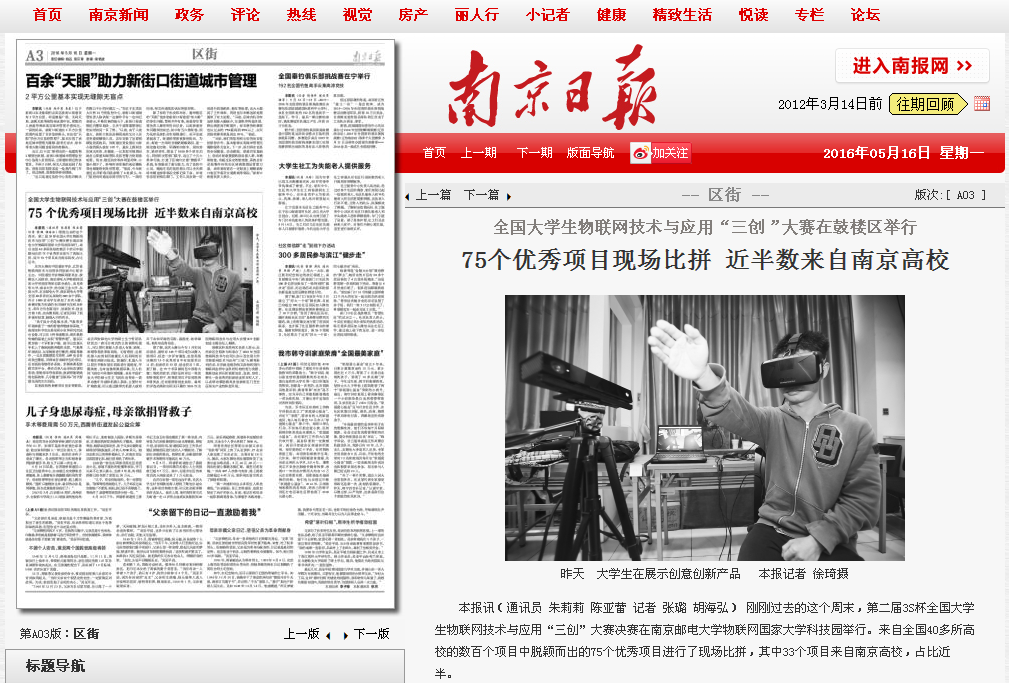 本报讯(通讯员 朱莉莉 陈亚蕾 记者 张璐 胡海弘)刚刚过去的这个周末,第二届3S杯全国大学生物联网技术与应用“三创”大赛决赛在南京邮电大学物联网国家大学科技园举行。来自全国40多所高校的数百个项目中脱颖而出的75个优秀项目进行了现场比拼,其中33个项目来自南京高校,占比近半。