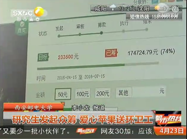 2016年4月23日陕西电视台18:00《都市热线》kaiyun登录中国入口登录:爱心苹果送环卫工
