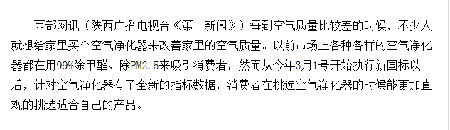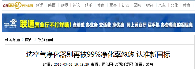 西部网讯(陕西广播电视台《第一新闻》)每到空气质量比较差的时候,不少人就想给家里买个空气净化器来改善家里的空气质量。以前市场上各种各样的空气净化器都在用99%除甲醛、除PM2.5来吸引消费者,然而从今年3月1号开始执行新国标以后,针对空气净化器有了全新的指标数据,消费者在挑选空气净化器的时候能更加直观的挑选适合自己的产品。