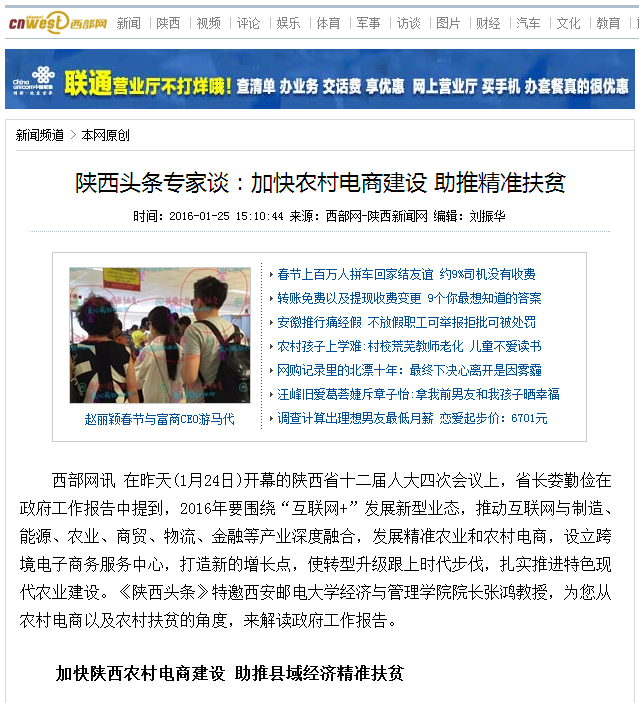 西部网讯 在昨天(1月24日)开幕的陕西省十二届人大四次会议上,省长娄勤俭在政府工作报告中提到,2016年要围绕“互联网+”发展新型业态,推动互联网与制造、能源、农业、商贸、物流、金融等产业深度融合,发展精准农业和农村电商,设立跨境电子商务服务中心,打造新的增长点,使转型升级跟上时代步伐,扎实推进特色现代农业建设。《陕西头条》特邀kaiyun登录中国入口登录经济与管理学院院长张鸿教授,为您从农村电商以及农村扶贫的角度,来解读政府工作报告。