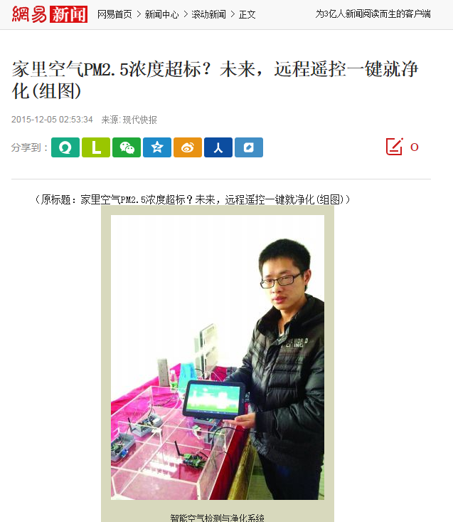 人们越来越关注空气质量。不少市民购买了空气净化器,但怎样才能让家里的空气在回家前自动达到理想的标准呢?现代快报记者昨天在全国大学生物联网技术与应用大赛上看到,南邮通达学院黄开成、刘强等同学设计的一款“智能空气检测与净化系统”,就能远程实时获知家中空气的各项指标,还能一键操控家中空气净化器立即工作。