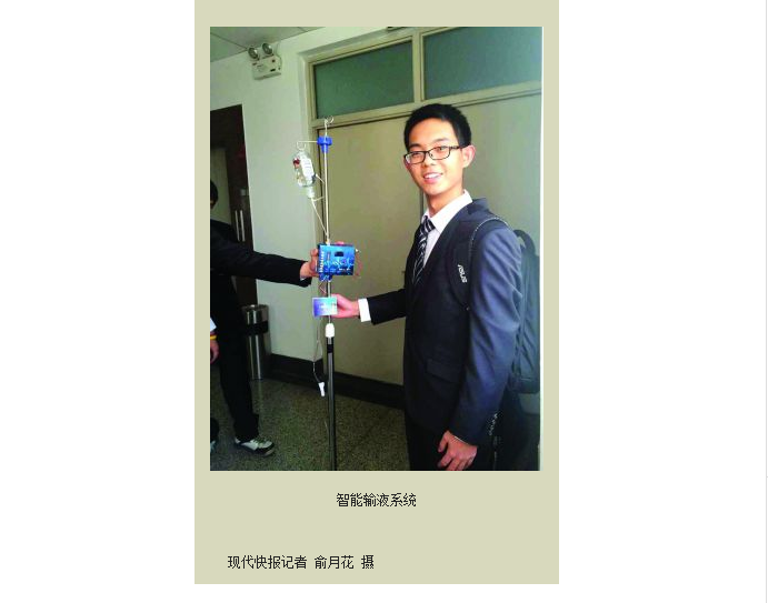 高杰告诉现代快报记者,最初决定设计这套系统,是因为团队里一位同学去医院输液的经历。“输液时一直看着点滴,生怕滴完了没及时叫护士出现回血。”高杰说,“我们就设计了一套传感器,放到患者手腕上,这样就可以实时检测患者体温、脉搏和血压,观察他们的身体在输液时是否有异常。”