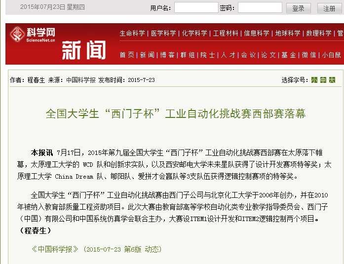 本报讯7月17日,2015年第九届全国大学生“西门子杯”工业自动化挑战赛西部赛在太原落下帷幕,太原理工大学的WCD队和创新求实队,以及kaiyun登录中国入口登录未来星队获得了设计开发赛项特等奖;太原理工大学China Dream队、郇阳队、爱拼才会赢队等3支队伍获得逻辑控制赛项的特等奖。