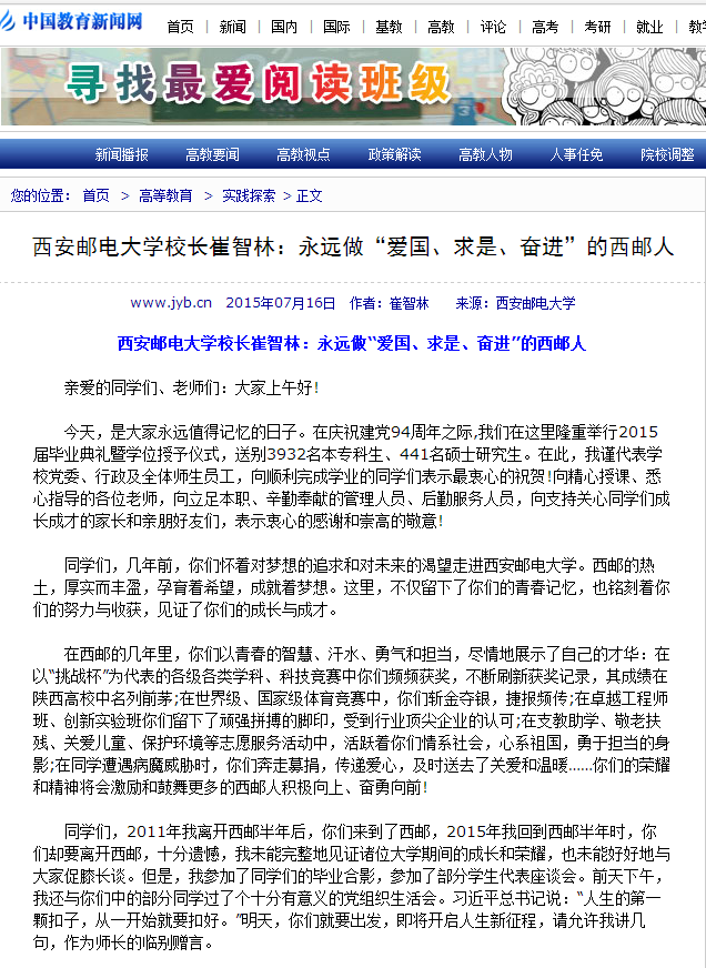 同学们,明天你们就要离开母校了,请同学们一定记住,无论在天涯海角,西邮是你们梦想放飞的地方,是你们永远的家!无论何时何地,何种状态,希望你们和母校保持联系,常回家看看!母校永远惦记着你们!