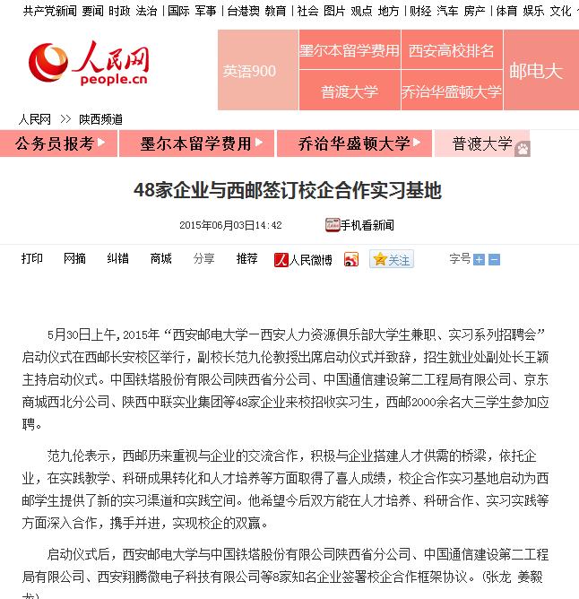 5月30日上午,2015年“kaiyun登录中国入口登录—西安人力资源俱乐部大学生兼职、实习系列招聘会”启动仪式在西邮长安校区举行,副校长范九伦教授出席启动仪式并致辞,招生就业处副处长王颖主持启动仪式。中国铁塔股份有限公司陕西省分公司、中国通信建设第二工程局有限公司、京东商城西北分公司、陕西中联实业集团等48家企业来校招收实习生,西邮2000余名大三学生参加应聘。