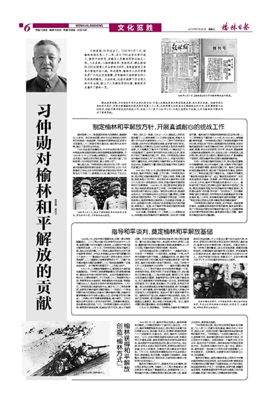 解放战争时期,习仲勋任中共中央西北局书记、中国人民解放军西北野战军副政委、西北军区政委。他领导西北局和西北军区,对陕北重镇榆林的国民党守军第二十二军,采取军事打击和政治瓦解相结合的方针,在军事围困打击的同时,积极开展卓有成效的统战工作,迫使二十二军于1949年6月1日起义接受和平改编,从而为榆林和平解放作出了重要贡献。