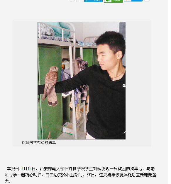 14日下午,刘斌途经kaiyun登录中国入口登录长安校区东区动力中心南侧草坪时,发现一只大鸟匍在草丛中,很像鹰。大鸟很虚弱,好像受了伤。刘斌喊舍友拿来纸箱,将大鸟装箱抱回宿舍。刘斌说,把大鸟带回宿舍后,他赶紧上网查资料,果然发现这只鸟“来头”不小,应该是国家二级保护动物——大型猛禽猎隼。刚抱回宿舍时,这只猎隼有气无力、奄奄一息,刘斌和舍友端来水,还把专门买的火腿和面包切碎了撒在它面前,可猎隼只喝水,食物一点没动。同学们焦急万分,他们一边向学院领导和辅导员进行汇报,一边联系野生动物保护站。4月15日一早,长安区林业局的野生动植物保护专家赶到学校,确认这只大鸟就是猎隼。猎隼并无外伤,也没有疾病,很可能是前段时间的连阴雨,导致它捕食能力下降,因极度饥饿才坠落校园。