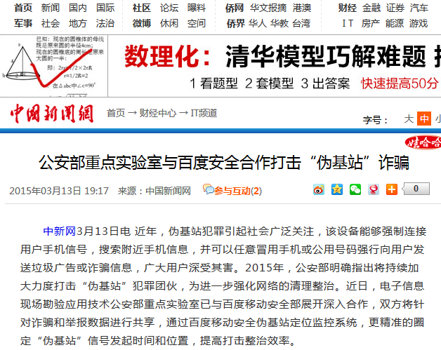 中新网3月13日电 近年,伪基站犯罪引起社会广泛关注,该设备能够强制连接用户手机信号,搜索附近手机信息,并可以任意冒用手机或公用号码强行向用户发送垃圾广告或诈骗信息,广大用户深受其害。2015年,公安部明确指出将持续加大力度打击“伪基站”犯罪团伙,为进一步强化网络的清理整治。近日,电子信息现场勘验应用技术公安部重点实验室已与百度移动安全部展开深入合作,双方将针对诈骗和举报数据进行共享,通过百度移动安全伪基站定位监控系统,更精准的圈定“伪基站”信号发起时间和位置,提高打击整治效率。