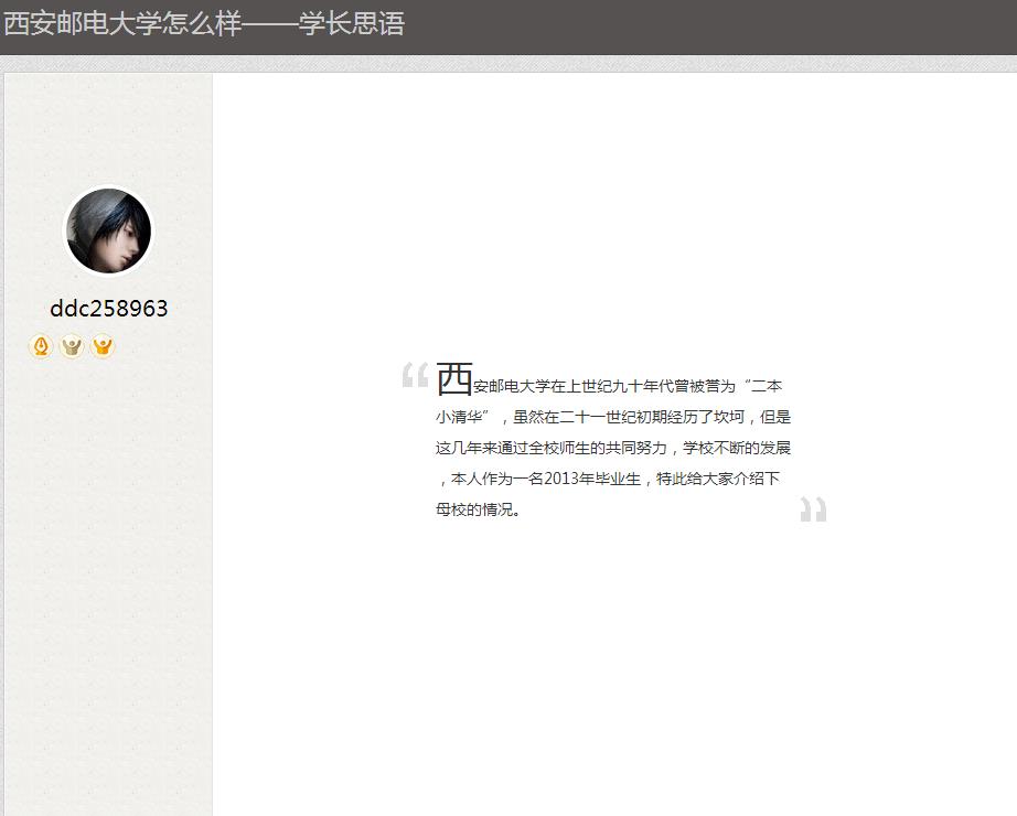 教学质量。这一点是很难说的,对于大学生而言,最重要的不是教师有多牛,而在于学生自身心智是否能够达到自制、自律、自觉的境界。每一年都有好几千的学生进来,有人是为了混个毕业证,也有人进来后依旧刻苦学习,我想说的是,只要你够上进、够勤奋,西邮完全可以成为你腾飞的起点。当然,学校也有不少的名师,尤其是在个别专业和电子科技竞赛方面,都能够寻求到非常好的指导老师,只要你够主动,可以说,四年下来,你已经击败了不知道多少的同届学生,相信自己,相信西邮,你完全可以成为一名成功的毕业生。