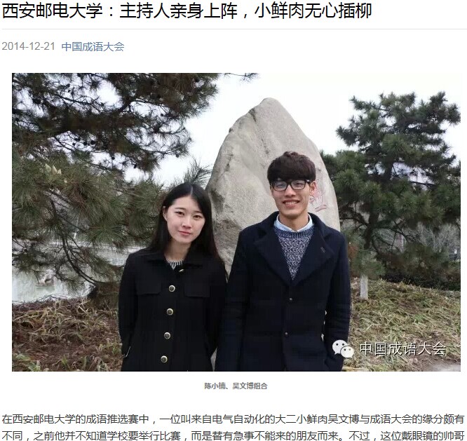 坦白说,能过参加成语大会,我很幸运,也很开心。没有什么特殊的其他原因,就是因为那是我喜欢的东西。
