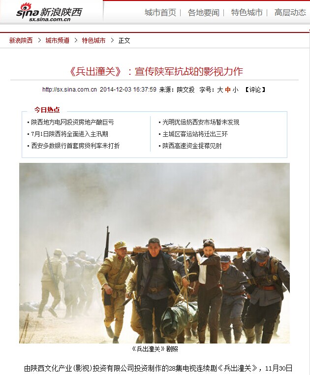 由陕西文化产业(影视)投资有限公司投资制作的28集电视连续剧《兵出潼关》,11月30日起在中央电视台8套电视剧频道播出。该剧以20世纪三四十年代陕西军民浴血抗战、保卫家园的历史为依据,讲述了三秦儿女为保卫潼关、保卫陕西、保卫大西北,以血肉之躯抗击日寇侵略的传奇故事,展示了中国人民在民族危机的紧要关头一致对外、英勇顽强的爱国情怀。
