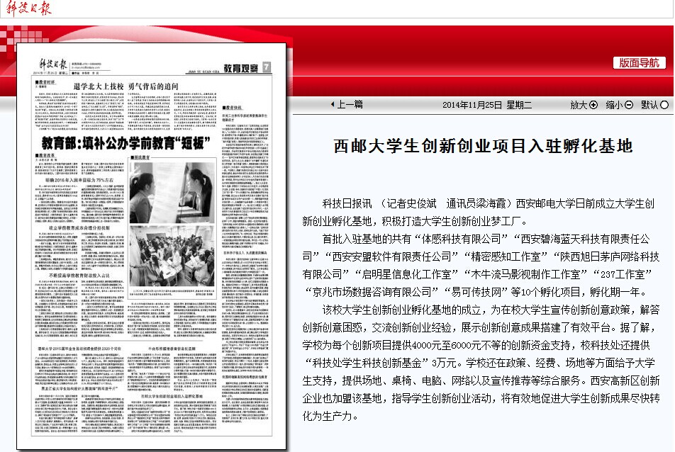 2014年11月25日,《科技日报》报道西邮大学生创新创业项目入驻孵化基地,相关链接: