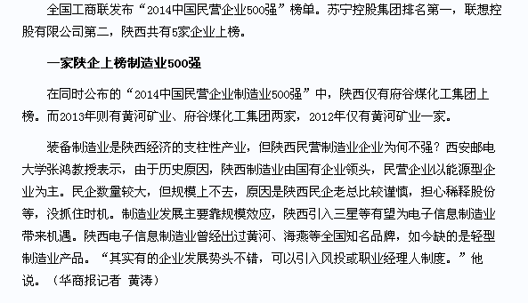 2014中国民企500强公布 五陕企上榜
