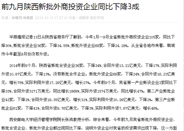 2014年前9个月,陕西省新批合资企业36家,下降34%;合同外资13.21亿美元,下降17%;实际利用外资10.87亿美元,下降13%。没有新批合作企业。新批外资企业69家,下降24%;合同外资16.23亿美元,增长75%;实际利用外资17.29亿美元,增长27%。今年前9个月,我省第一产业新设企业2家同比下降33%;合同外资3271万美元,同比增长1868%;实际外资1574万美元,同比增长47%。第二产业新批企业42家,下降2%;合同外资19.35亿美元,增长31%;实际利用外资20.26亿美元,下降2%。第三产业新批企业61家,下降41%;合同外资9.76亿美元,下降3%;实际利用外资7.87亿美元,增长46%。