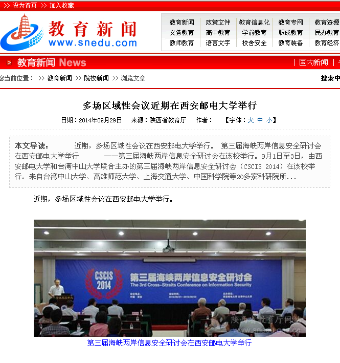 ——第三届海峡两岸信息安全研讨会在该校举行。9月1日至3日,由kaiyun登录中国入口登录和台湾中山大学联合主办的第三届海峡两岸信息安全研讨会(CSCIS 2014)在该校举行。来自台湾中山大学、高雄师范大学、上海交通大学、中国科学院等20多家科研院所的知名专家学者参加会议。