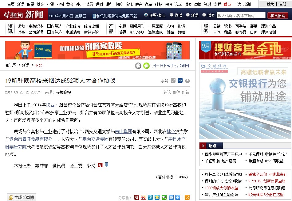 24日上午,2014年陕西·烟台校企合作洽谈会在东方海天酒店举行,现场共有驻陕19所高校和驻烟4所高校及烟台市80多家企业参与。烟台共有30家单位与高校在人才引进、毕业生见习基地、人才定向培养等多个方面达成合作意向。