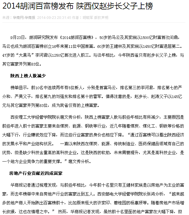 9月23日,胡润研究院发布《2014胡润百富榜》,50岁的马云及其家族以1500亿财富首次问鼎,马云也成为胡润百富榜创立16年来第11位中国首富。60岁的王健林及其家族以1450亿财富退居第二。47岁的“大黑马”李河君以1250亿首次进入前三。与往年相比,今年陕西省只有赵步长父子上榜,与其它富豪并列第83位。