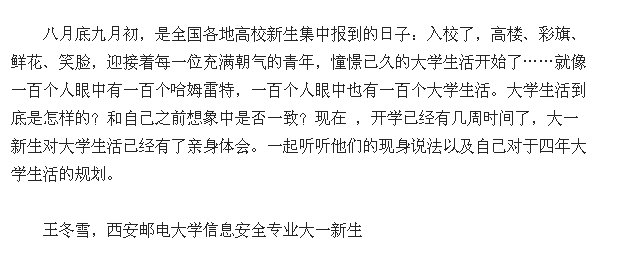八月底九月初,是全国各地高校新生集中报到的日子:入校了,高楼、彩旗、鲜花、笑脸,迎接着每一位充满朝气的青年,憧憬已久的大学生活开始了……就像一百个人眼中有一百个哈姆雷特,一百个人眼中也有一百个大学生活。大学生活到底是怎样的?和自己之前想象中是否一致?现在 ,开学已经有几周时间了,大一新生对大学生活已经有了亲身体会。一起听听他们的现身说法以及自己对于四年大学生活的规划。